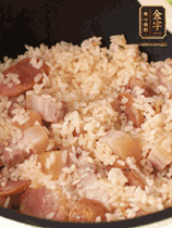 咸肉香肠下锅煸出油脂香味,倒入洗净的大米搅拌